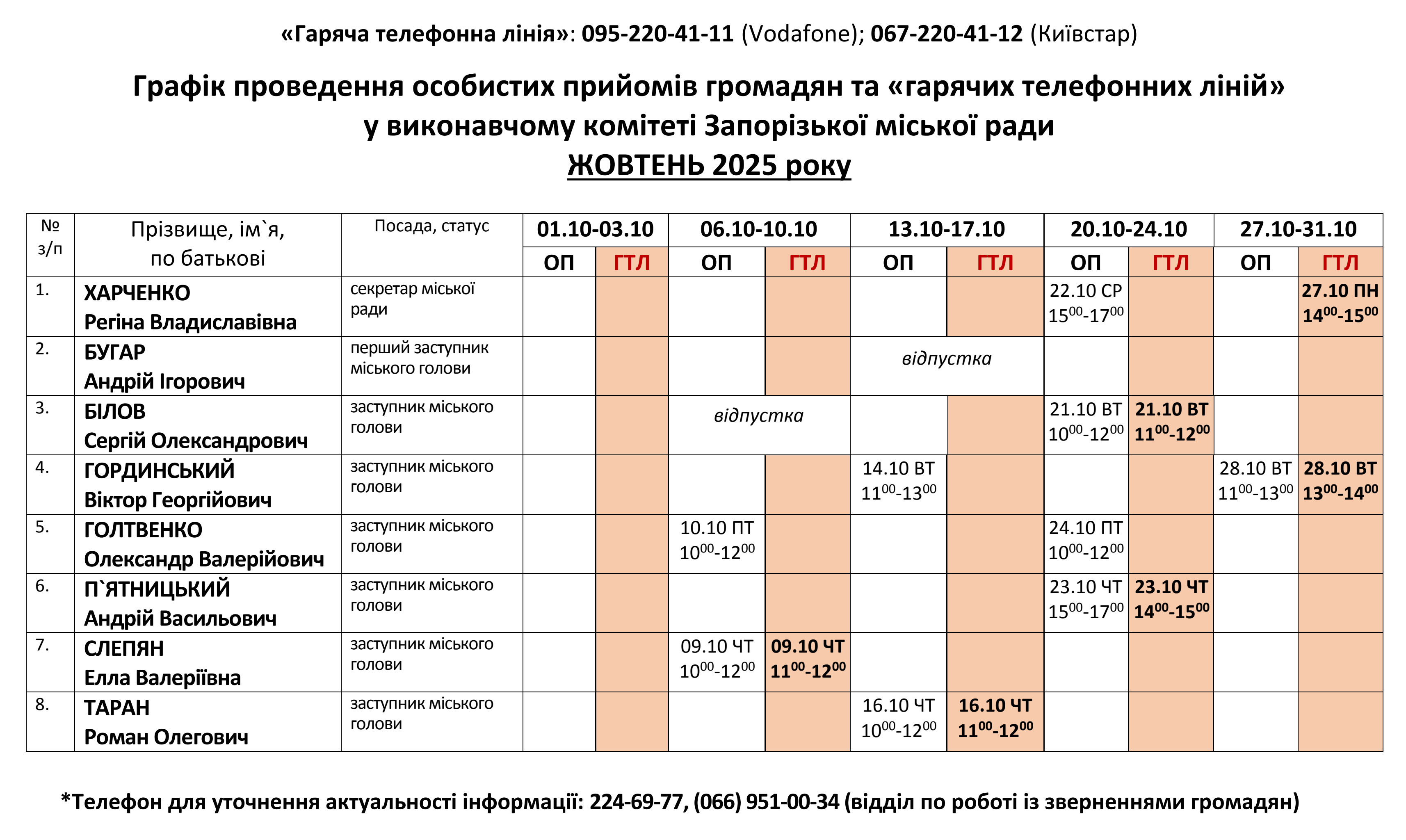 Запис на особистий прийом до керівників міста за телефоном не здійснюється. Довідкову інформацію про особистий прийом громадян керівниками міста можна отримати за телефоном (061)224-69-77.